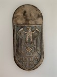 This original quality example of the Chom battle Shield is Badge is of exceptionally high quality. This is the early War style made with higher quality materials and exhibiting exceptionally fine detail. The shield is die struck i using the correct gauge material from original tools and dies. It is attached to the steel backing plate by means of 4 hard soldered prongs . The award has really authentic and pleasing antiqued finish.