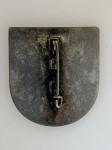 This pin was worn by dock workers at the 'La Pallice' U-Boat yards during WWII. This example is made from zinc with a blue painted detailing. It has a dull finish with some tarnishing on the back and front. A serial number in stamped into the front of the badge. It is complete with a brooch type pin. The insignia measures 35mm x 37mm.