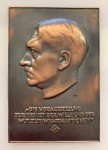 An official award bestowed upon political Nazi party and state officials in recognition of special achievement. This heavy cast wall plaque has an attractive antique copper- bronze finish measures 97 x 141 mm and is approximately 4mm thick. The obverse depicts a profile of Hitler above a swastika and inscription in German which translates loosely as 'The condition of action is the will and the courage of truth'. The reverse bears another inscription which translates as 'The first plaque produced from a live sitting which the Fuhrer and Reichsleitung have found to be very good'.