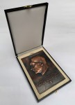 This heavy bronzed plaque is supplied complete in its fitted presentation case. The case is covered in heavy grained leatherette and lined in cream velvet with a recess to accept the award. The lid is lined in off white silk. With brass catch.